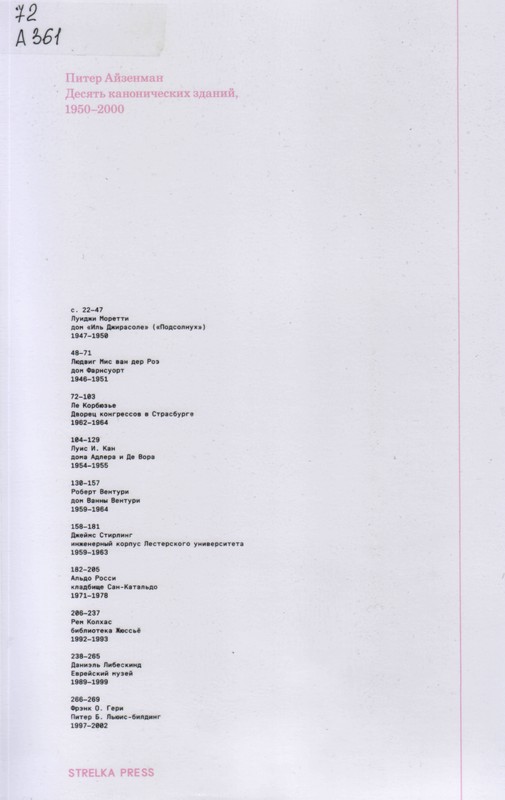Автор: Айзенман П. Заглавие: Десять канонических зданий: 1950-2000 Десять самых важных послевоенных архитекторов, десять очень разных зданий — они не только построены с разными целями, в разной стилистике и из разных материалов — различаются и их теоретические и идеологические программы. Умение понимать эти программы требует особых интеллектуальных навыков. Опыт и урок такого пристального чтения архитектуры — в книге лидера деконструктивизма и одного из крупнейших современных архитектурных теоретиков Питера Айзенмана. Ссылка на полные выходные данные – библиографическое описание издания – http://192.168.20.6/marcweb2/Default.asp Издание находится в библиотеке ИСАиИ, пр. К. Маркса, 50, ауд. 301 |